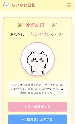 こんにちは♡ 今日は体調が良い感じ♡毎日よかったらいいのに😭 久々にブルダック食べようかな?笑 書くことがないので笑久々に診断系やってみたよ☺︎ https://chiikawabiyori.com/chiikawa-shindan♡ちいかわキャラ診断♡ 私はちいかわタイプでした🐰 あんまりちいかわ詳しくないんだけどちいかわにでてくるキャラって一人一人性格が違うんだね🥺 ちいかわ良いよとお勧めされたので見てみようかなって思いました🫶 今日も一日頑張りましょう♡ それではこのへんで!