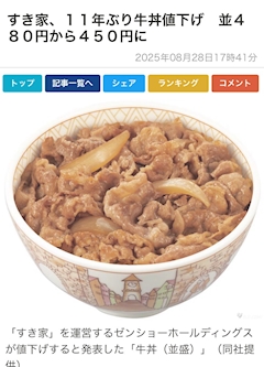こんばんは✨️ ATHENAのあたんです。 もう今週で8月が終わることにビクビクし始めました。 最近ニュース見るのにハマってるんだけど、 今日のニュースはこんなん^_-☆ すき家の牛丼値下げ(* 'ᵕ' ) いつも通り値上げのニュースかなって普通にテレビ見てたら、 全然値下げでびっくり。 松屋と吉野家ぬいて、 1番安くなったらしい。 ねずみ事件の巻き返しなんだろうけどこんなことできるの凄くて、 マネジメント学んでる身としてすごく勉強になりました😣😣 ちなみにわたしはすき家の高菜明太牛丼が好きすぎて、 すき家にしか行かないです。 それでは今日はこのへんで ばいにゃる あお