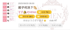 おはようございます☀️ club ATHENAのすずです🔔 本日はメンテナンスがあるとのことで 定時の8時から少し遅れて ブログ投稿させていただきます! なんと! 全国100位以内に入り! バッジ3つ付きましたー✨ 今だけかもしれないから スクショ撮っといた😉 みてみてー! 同じアテナのあやかさんと隣同士🫶 これも! ここを見てくれて スパコメ送ってくれたり スーパーいいねくれたり いいねしてくれたり コメントくれたりする みなさんのおかげです✨ ポイントももちろんだけど ほんとにブログを書く モチベーションになってる! 感謝🙏 ありがとうございます!! これからもね ゆるゆるとですが ブログ頑張っていくので 応援お願いします🙇 そして本日出勤予定でしたが 昼職都合で間に合わなそうで お休みをいただきました。 来てくださる予定だった方 大変申し訳ありません💦 今月全然出れてないので! 来週こそは出ます! では、また👋 すず🔔 前回のブログの スーパーいいね返信↓ 明日、餃子についてのブログ 再度あげるので 何派かコメントくれた方は 明日ブログに載せます! それ以外のコメント返信だけ↓ 他にもスーパーいいね、いいね お気に入りなど ありがとうございます✨ お返し気長にお待ちください😌 いいね返しのみ、ランダムです。 ご了承ください🙇